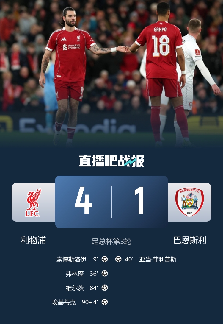 索博斯洛伊世界波,维尔茨、埃基蒂克破门,最终利物浦4-1击败巴恩斯利,晋级足总杯32强。