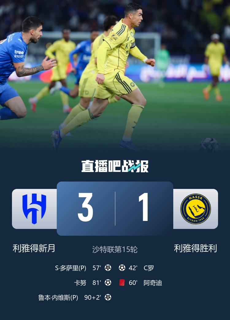 C罗破门,阿奇迪肘击内维斯直红被罚下,十人利雅得胜利1-3利雅得新月3连败距榜首7分。