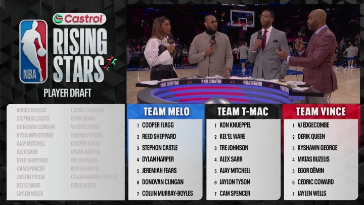 麦迪队:克尼佩尔(黄蜂)、韦尔(热火)、特雷·约翰逊(奇才)、萨尔(奇才)、阿杰伊·米切尔(雷霆)、杰伦·泰森(骑士)、卡姆·斯潘塞(灰熊);